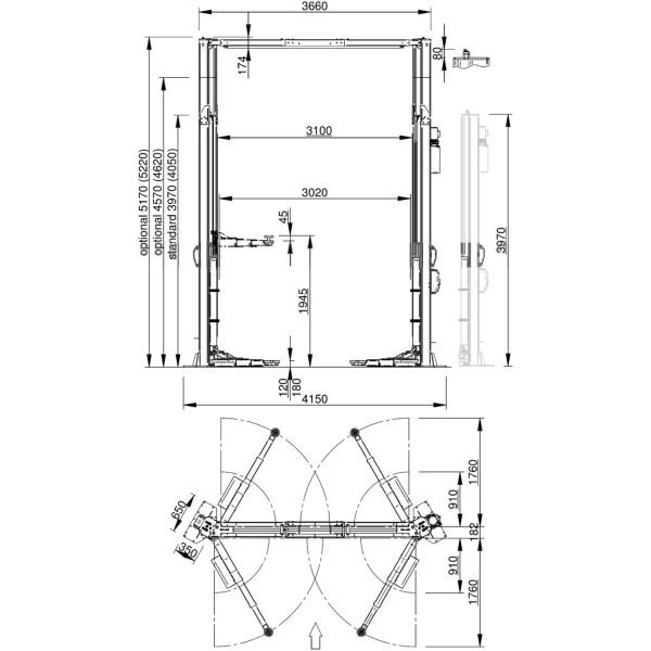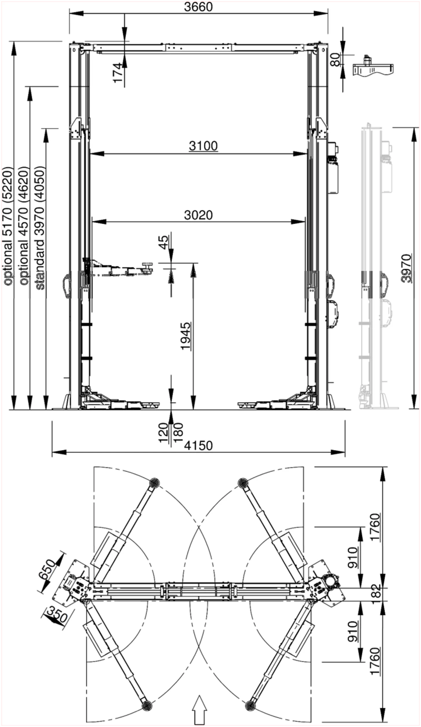 Kaksipilarinostimen korkeus on 4050 mm, siihen on saatavilla kahta jatkopalaa: