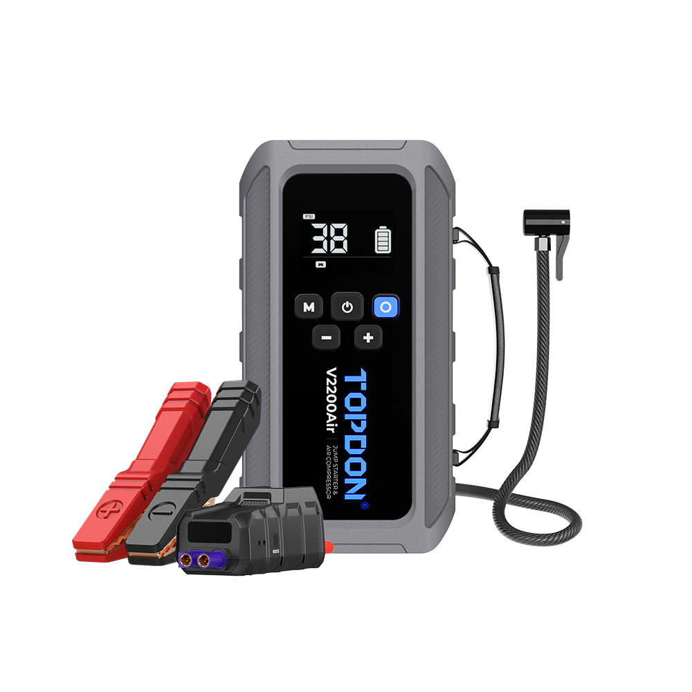 - V2200Air tarjoaa voimakkaan 2200A huippuvirran, joka pystyy käynnistämään ajoneuvot, joissa on jopa 8,0 litran bensiinimoottori tai 6,0 litran dieselmoottori vain 2 sekunnissa. Olitpa sitten jumissa syrjäisessä paikassa tai käsittelemässä tyhjää akkua kiireisenä päivänä, tämä vankka laite varmistaa, että pääset nopeasti takaisin tielle ilman viivettä.