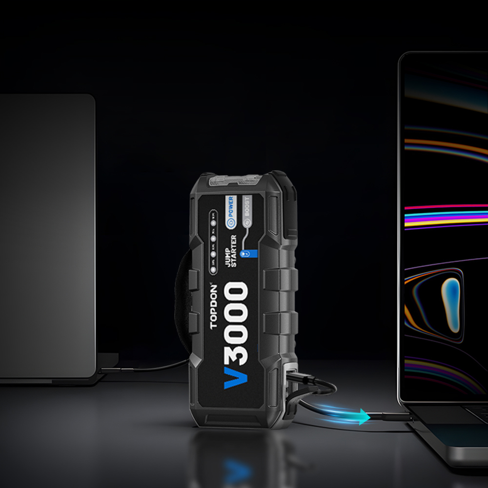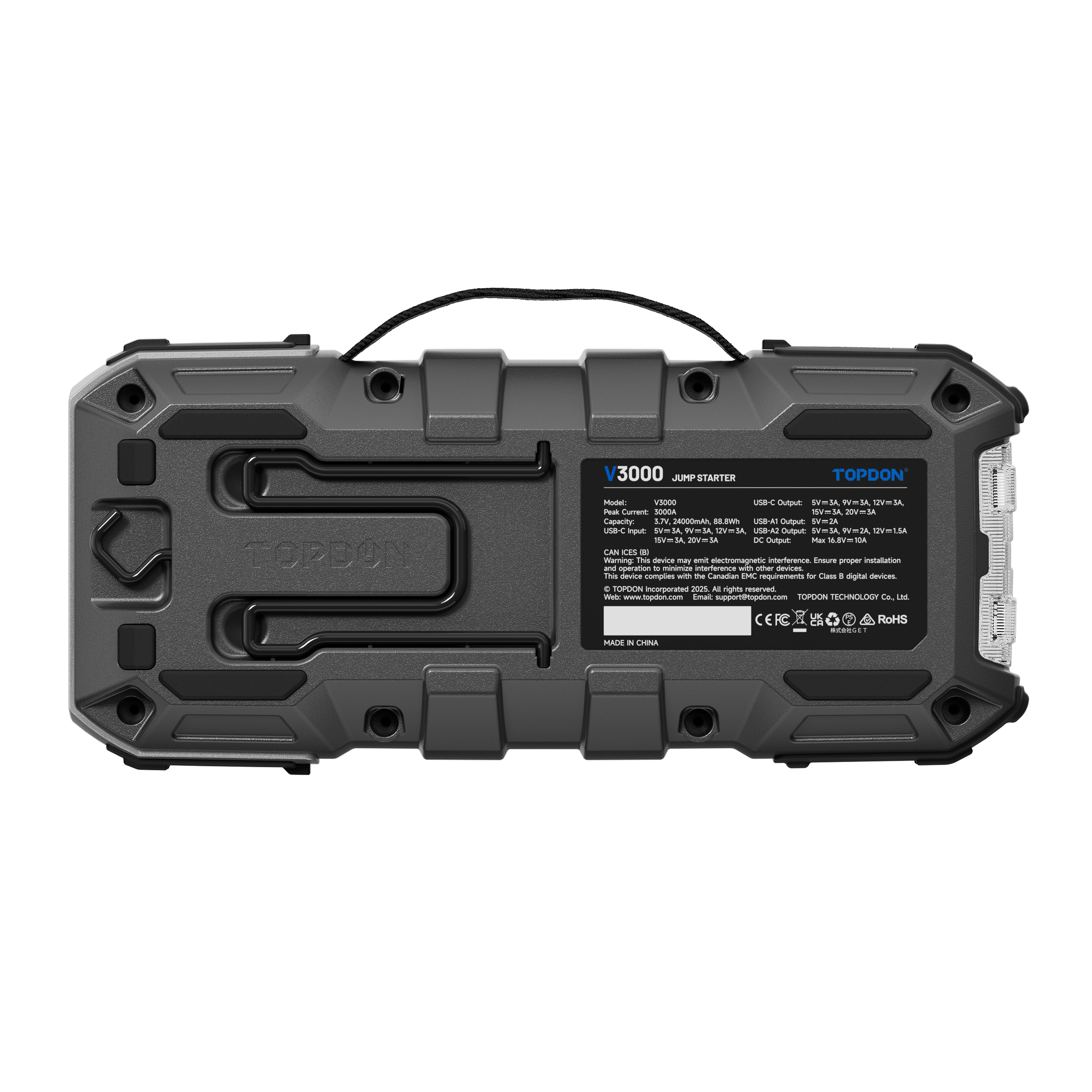 V3000 on enemmän kuin pelkkä käynnistinlaite; se toimii myös monitoimisena kannettavana virtapankkina. Varustettuna USB Quick Charge 3.0:lla ja 60W pikalatauksella varustetulla Type-C-portilla, se voi ladata älypuhelimia, tabletteja, kannettavia tietokoneita ja muita laitteita nopeasti. 12V/10A DC-ulostulo tukee myös lisälaitteita, kuten ilmakompressoreita, rengaspumppuja ja kannettavia jääkaappeja, tehden siitä todellisen auton hätävirtalähteen.