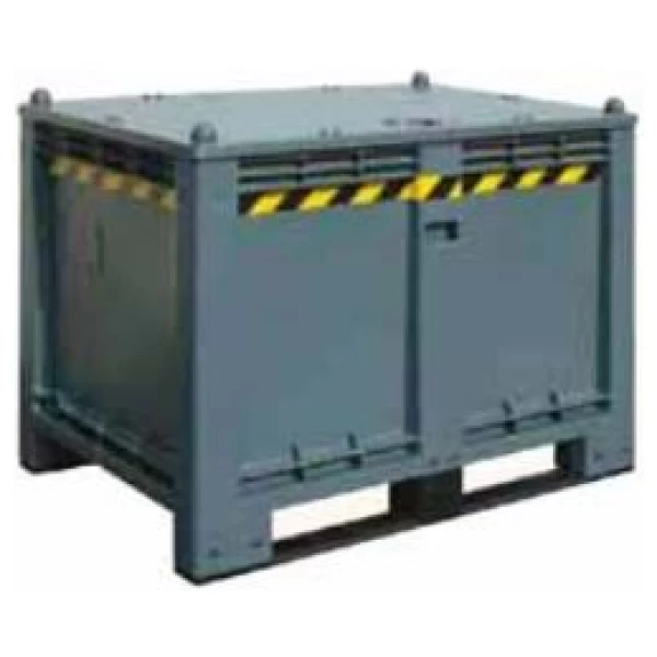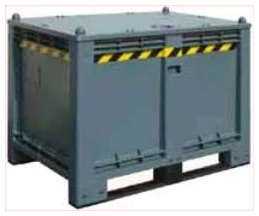 Happokestävästä polypropeeniko polymeeristä valmistettu kuormalavakontti käytettyjen akkujen, öljynsuodattimien tai muiden haitallisten osien ja aineiden varastointia varten.