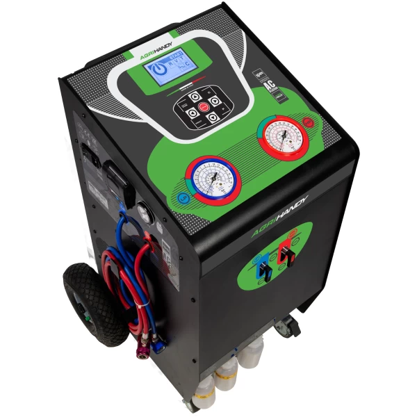 Liikuteltava ilmastoinnin huoltolaite, jossa lukittava vaaka ja illmatäytteiset pyörät Spin OK Clima Agri Handy.