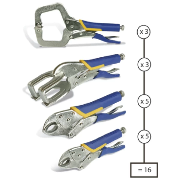 16 kappaleen lukkopihtisarja. Sisältää neljää eri mallista lukkopihtiä.