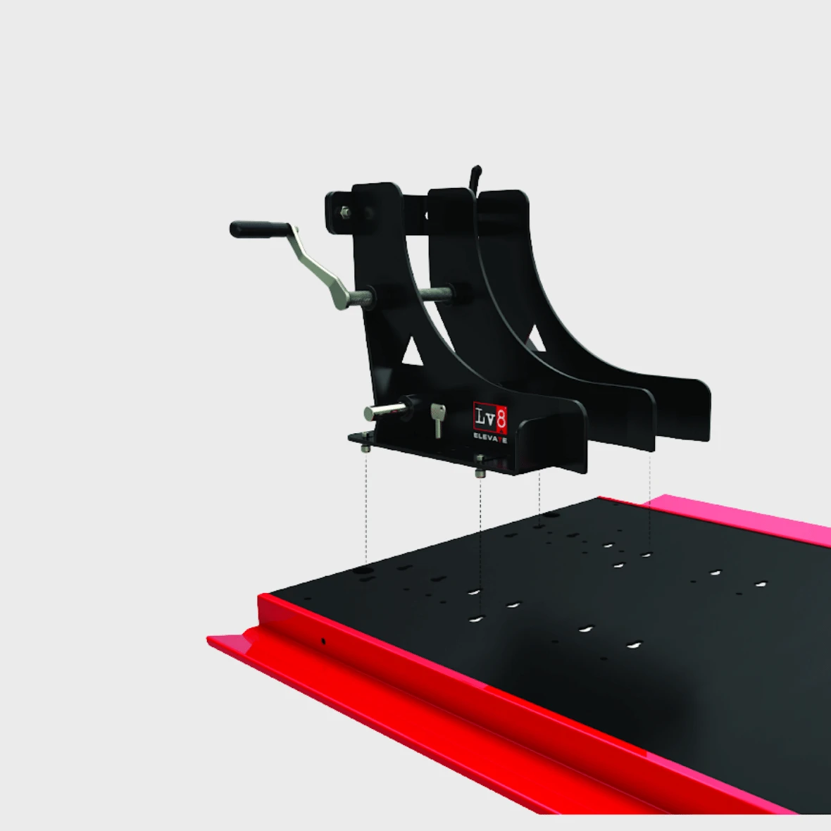LV8 moottoripyöränostimien lisävarusteeksi myytävä pika asennussarja mekaanisille ja pneumaattisille pyöränkiinnikkeille.
