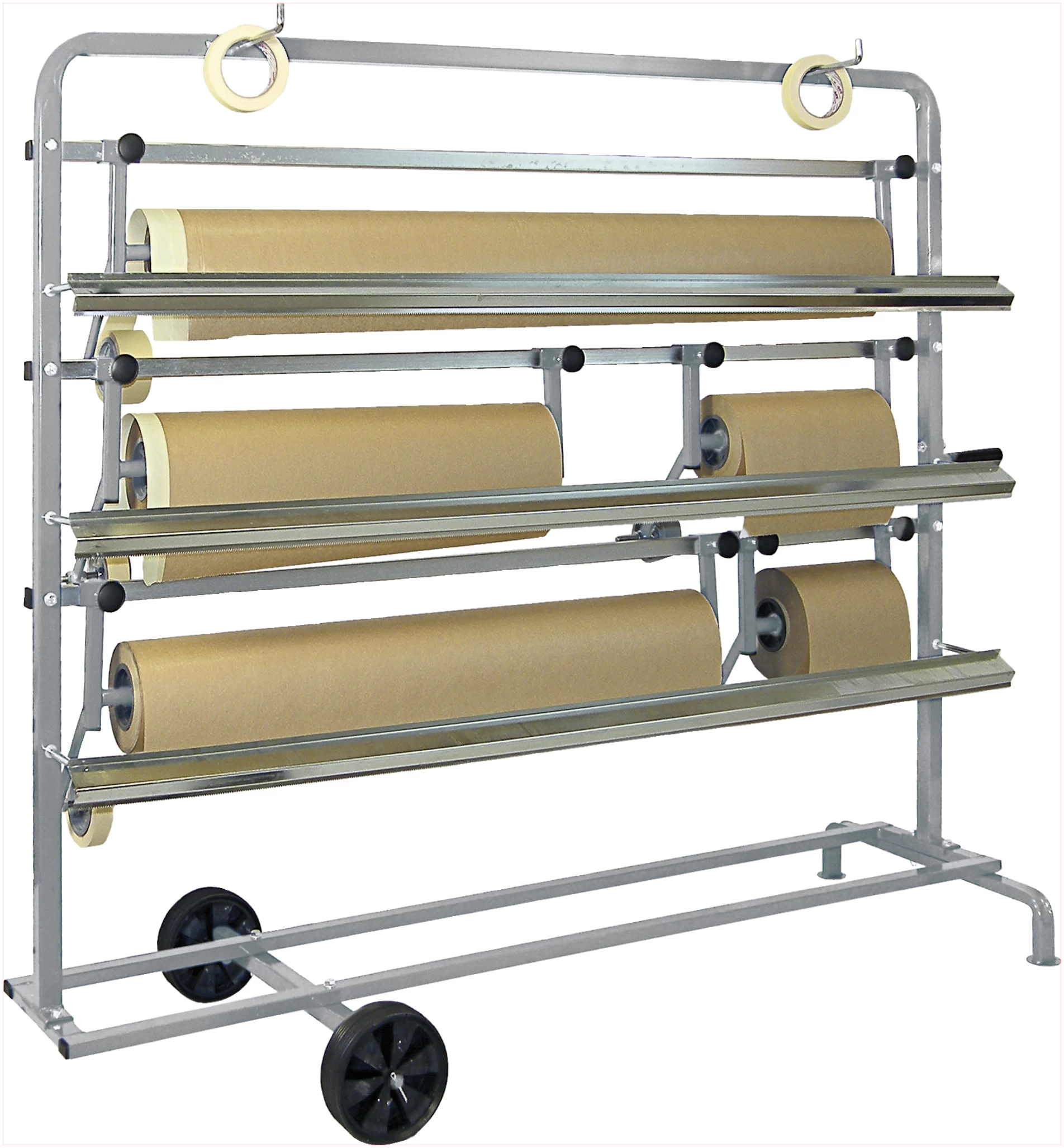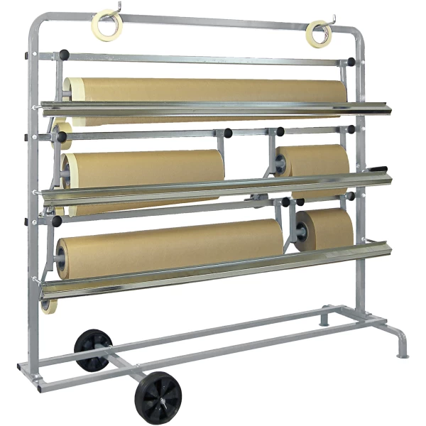 Suuri vaunu 5 rullalle peitepaperia ja/tai peitemuovia, 30–120 cm. Helppo paperin kiinnitys ajoneuvon edestä, takaa tai sivulta. • Rullan enimmäiskoko 120 cm • Terän leveys: 140 cm (x3) • Vankka ja vakaa maalattu teräsrakenne. • Helppo liikutella: 2 kumipyörää.