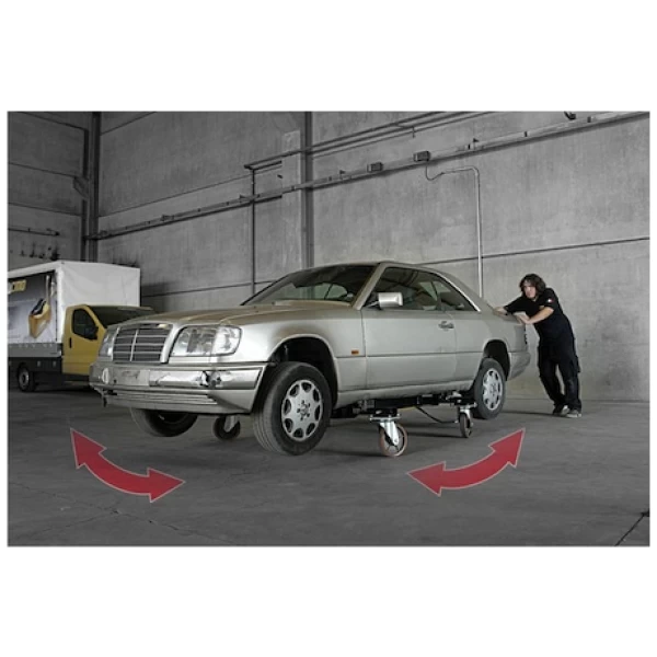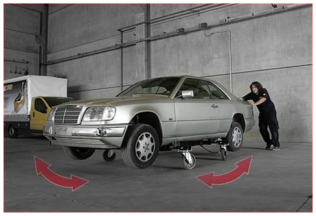 Käänteentekevä kaksitoiminen nostimen ja siirtolaitteen hybridi, jonka avulla auton liikuttelu ympäri hallia käy vaivattomasti.