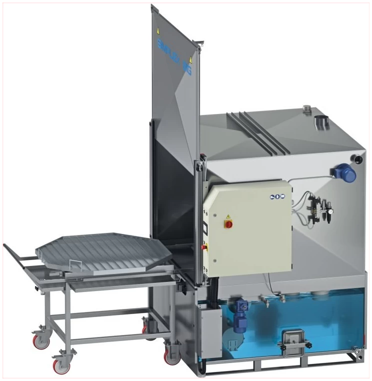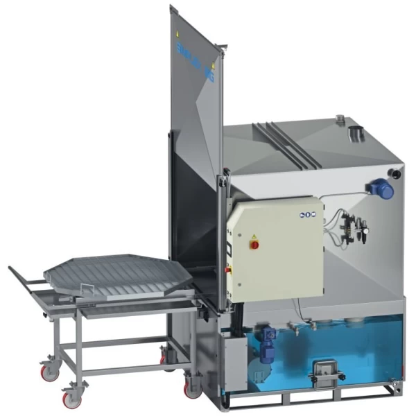 Erikoisvalmistettu Simplex Big 1800 elintarviketeollisuuden muovilaatikoiden pesuun: