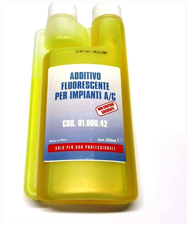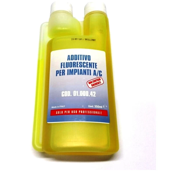 Suuri 350 ml pullo ilmastoinnin vuodonetsintäainetta. Väriainetta lisätään ilmastointiöljyn sekaan jolloin mahdolliset vuotokohdat paljastuvat UV-valon avulla.